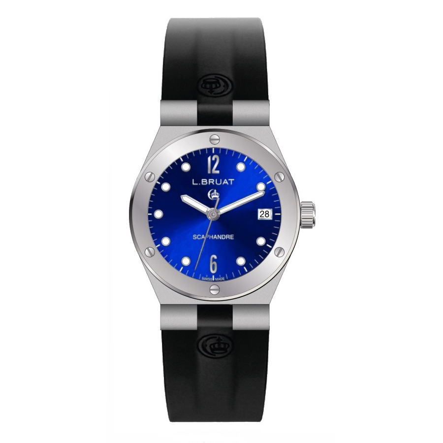 Swiss watch with steel case, anti-reflective sapphire crystal, rubber strap and superluminova needles.