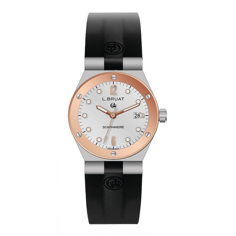 Swiss watch with steel case, anti-reflective sapphire crystal, rubber strap and superluminova needles.