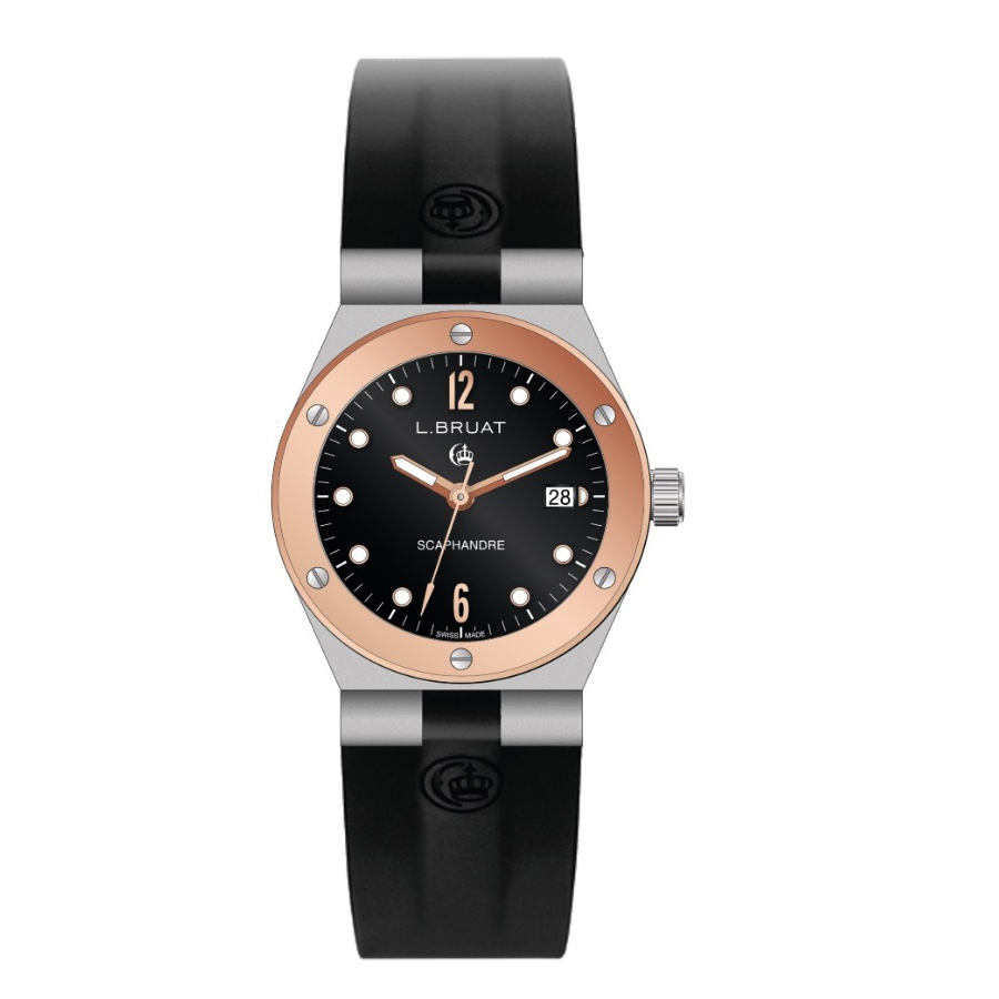 Swiss watch with steel case, anti-reflective sapphire crystal, rubber strap and superluminova needles.