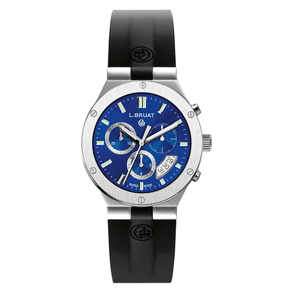 Swiss watch with steel case, anti-reflective sapphire crystal, rubber strap and superluminova needles.