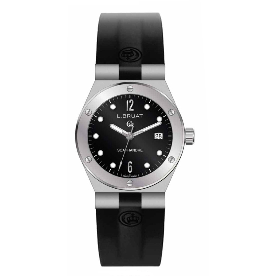 Reloj suizo con caja de acero, cristal de zafiro antirreflectante, correa de caucho y agujas superluminova.