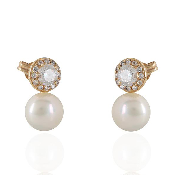 Yellow gold earrings 18 carats “tu y yo”, orla de circonitas con centro en circonita y perla de 7 mm.