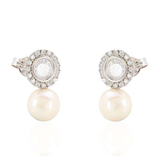 White gold earrings 18 carats “tu y yo”, orla de circonitas con chatón en circonita y perla de 7 mm.